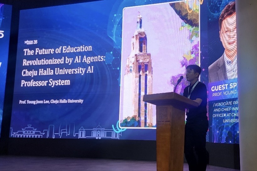 I shared how AI agents are revolutionizing both education and drug discovery. My first part of the keynote introduced Cheju Halla University’s AI Professor System—a platform that creates personalized AI companions for students. Key features include Socratic dialogue agents, adaptive learning paths, and 24/7 virtual professor support. As I emphasized: “We’re not just digitizing teaching—we’re creating AI companions that learn and grow with every student.”